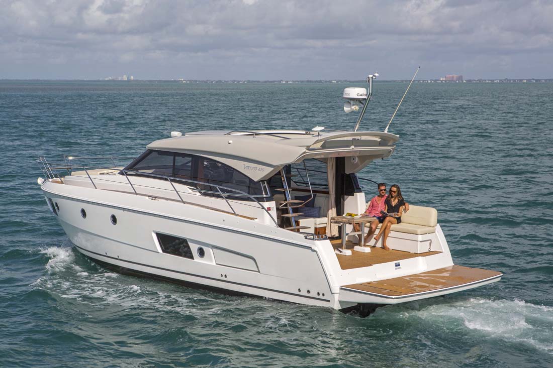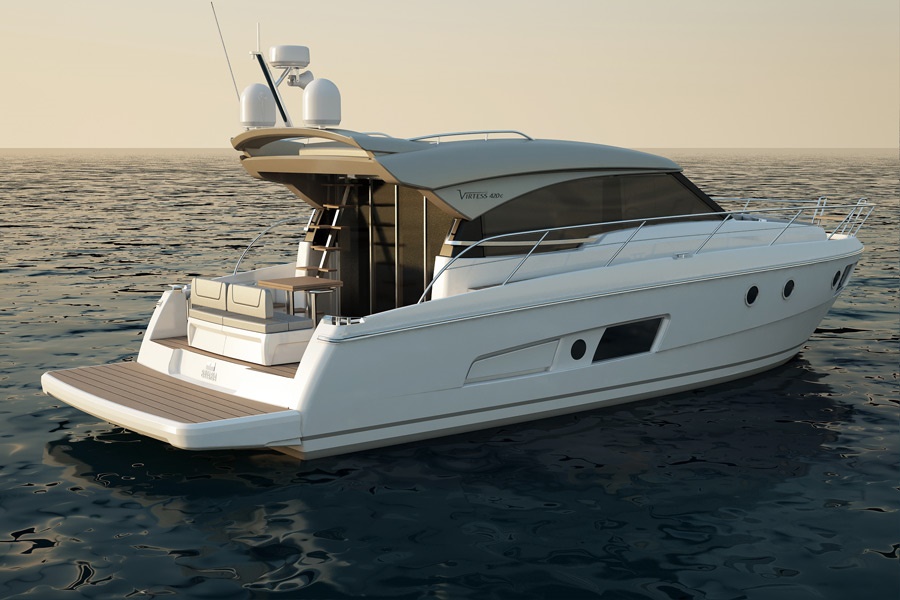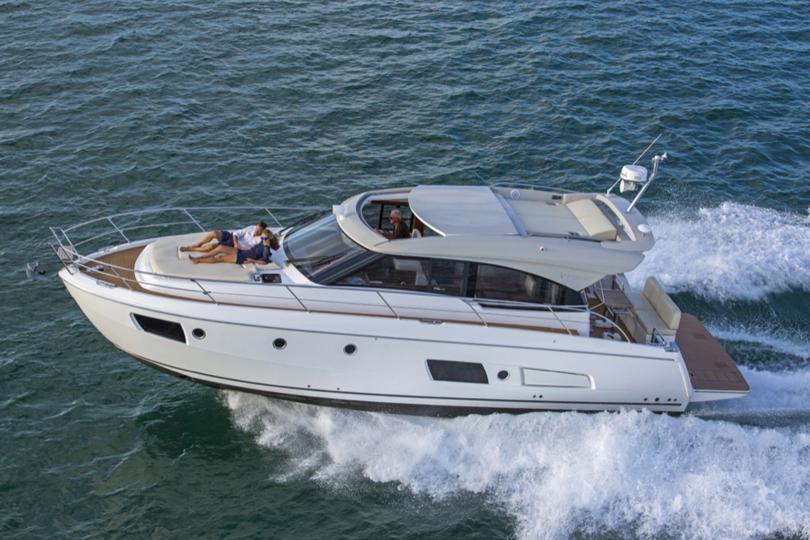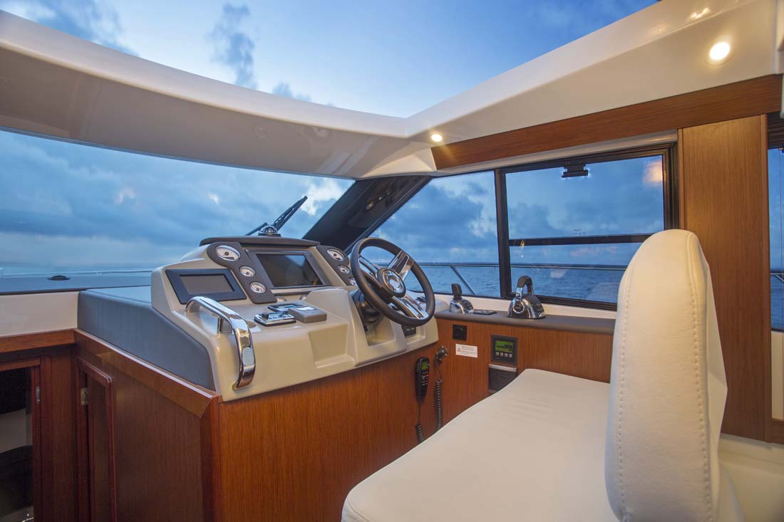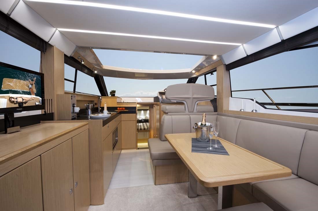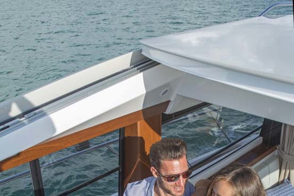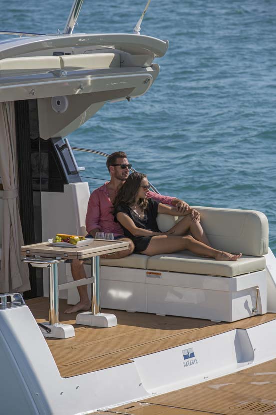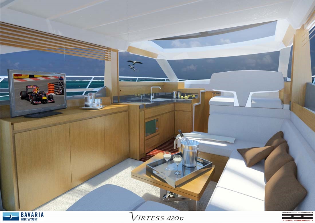 Meget lys og venligt design kendetegner denne coupe-og så er der endda solseng på toppen af båden, en smart detalje fra Bavaria. Innovativt design og flotte linier kendetegner Bavaria's nye linie.