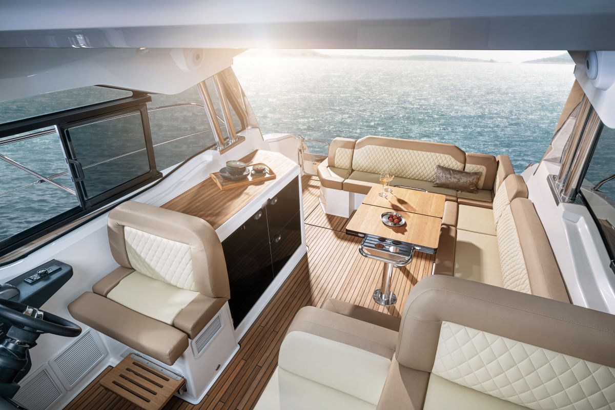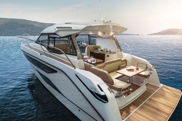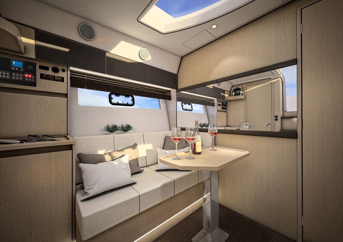 Den store solseng agter kan omdannes til komfortabel sofa med bord, praktisk hvis man er mange ombord, og så har man vandet helt tæt på. Badeplatformen kan fåes som sænkbar, elegant løsning til en gummibåd, og super til badning etc. Båden fåes i 2 versioner, hardtop el. Coupe, og med mulighed for soltag i fast glasfiber.